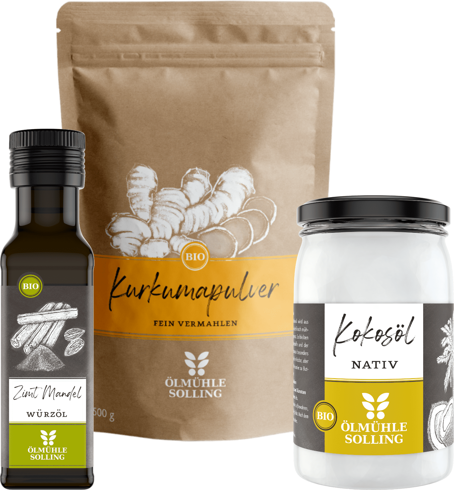 Dieses Set bestehend aus Kurkumapulver, Kokosöl und Zimt-Mandel Würzöl ist ideal für die Zubereitung von Goldener Milch geeignet. Die weiteren Zutaten finden Sie in unserem Rezept.