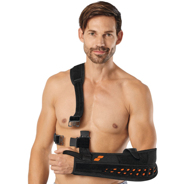 Die Sporlastic Omo-Hit Immobil ist eine Schultergelenksorthese zur Immobilisierung des Schultergelenks, um die Schulter, den Oberarm und den Ellenbogen zu entlasten.Einschränkung der Beweglichkeit des SchultergelenksFixierung des gesamten Armes in definierter PositionMit zusätzlichem Leibgurt zur FixierungSchnellverschlüsse zum einfachen und einhändigem An- und AblegenAnatomisch geformte ArmauflageArm- und Handfixierung mit KlettverschlüsseArmschlinge aus offenmaschigem, atmungsaktivem Material, für angenehmen TragekomfortDaumenschlaufe für bessere StabilitätGurte und Unterarmposition individuell einstellbarAnlegen: