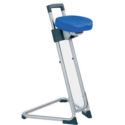 Stehhilfe die Standhafte in Edelstahl, stabiler Stehstuhl mit blauem Drehsitz, vom TÜV Rheinland für die Lebensmittelindustrie zugelassen