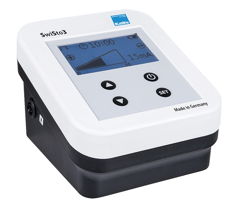 SwiSto 3 Iontophorese Gerät – Set zur Hand- und Fußschweißbehandlung Modernes Design Einfache Bedienung und Menüfuhrung Grafik-LCD-Display mit Hintergrundbeleuchtung Ohne Sprachsoftware-international verwendbar Wahlweise Gleich- oder Pulsstrom Automatische Stromregulierung, kein Stromschlag- empfinden bei Herausnahme der Hände und Füße Behandlung der Hände ohne Fußschalter möglich Folientastatur, vollautomatischer Betriebsablauf Timerfunktion bschaltautomatik, sleep modus Li-lon Ladebatterie mit Ladefunktion, Ladestecker Ladezyklus bis zu 10 Behandlung à 20 Minuten Leicht desinfizierbar Erfüllung aller Vorschriften und Normen nach MPG Medikamentenfreie Therapie Die Vorteile des SwiSto III Erhöhte Schweißneigung an Füßen, Handen und Achselhöhlen ist für viele Betroffene oft sehr unangenehm. Die Iontophorese hat sich in diesem Fall als wirkungsvolle, langfristig kostengünstige, sichere und leicht anwendbare Therapieform bewährt. Im Vergleich zu injektionen oder der operativen Therapie ist die Iontophorese-Therapie schmerzfrei, Medikamente können Nebenwirkungen verursachen. SwiSto3 Gleich- und Pulsstromtherapie mit nur einem Gerät für die Hand-, Fuß- und Achselschweißbehandlung. Die 3. Generation von KaWe, neueste Technologie und Erfahrung in der Herstellung seit mehr als 20 Jahren. Das neue SwiSto3 in modernem Design ist äußerst benutzerfreundlich und bietet Ihnen für die Behandlung der Hyperhidrosis zwei Möglichkeiten: Therapie mit Gleichstrom oder Therapie mit Pulsstrom, der besonders für empfindliche Patienten oder Kinder und Jugendliche geeignet ist. Das neue SwiSto3 ist ohne Sprachsoftware. Der Benutzer wird einfach durch das Menü geführt und muss die gewünschte Einstellung nur noch mit der SET-Taste bestätigen. Das Grafik-LCD-Modul ist beleuchtet und bietet eine übersichtliche und deutliche Ansicht aller Einstellungen. Der Anwender kann während der Behandlung die Stromstärke selbst verändern, so dass eine zweite Person, sowie ein Fußschalter nicht notwendig sind. Die automatische Stormregulierung hat den Vorteil, dass der Nutzer dieses Gerätes kein Stromschlagempfinden (Weidezauneffekt) bei Herausnahme der Hände und Füße während der Behandlung verspürt. Das SwiSto3 ist mit einer Abschaltautomatik ausgestattet. Bei Nichtausschalten des Gerätes nach der erfolgten Behandlung schaltet sich dieses selbständig nach 2 Minuten ab. Anwendung Die Iontophorese-Behandlung der Hyperhidrosis manum et pedum ist ein physikalische Anwendung. Sie wurde erstmals 1952 von Boumann und Grunewald-Lentzer beschrieben. Gleichstrom oder gepulster Gleichstrom bewirkt einen lonentransport durch die Haut.Die Kunststoffwannen werden ca. 3-4 cm hoch mit lauwarmen Leitungswasser gefüllt, so dass die Hand-oder Fußflächen vom Wasser bedeckt sind. Vor dem Füllen der Wannen müssen die Elektroden mit den Netzauflagen abgedeckt werden, um den unmittelbaren Hautkontakt zu vermeiden. Die Schwammtaschen zur Achselbehandlung müssen vor Benutzung kräftig mit Wasser getränkt werden. Die Behandlung sollte mindestens dreimal pro Woche bei einer durchschnittlchen Behandlungsdauer von 15 bis 20 Minuten bis zum gewünschten Heilungserfolg durchgeführt werden. Dieser tritt in der Regel nach etwa 10-15 Behandlungen ein. Danach sollte die Therapie zur Erhaltung des Behandlungserfolges regelmäßig, mindestens einmal pro Woche, weitergeführt werden. Der Strom, der durch die Elektrodenplatten fließt, kann je nach Anwendungsbereich (Hände, Füße, Achseln) bis maximal 25 mA hochgeregelt werden. Wir empfehlen, bei starker Verhornung der Haut die Polarität zu wechseln, da der Anode empirisch eine stärkere Wirksamkeit nachgesagt wird. VIDEO Zusätzliche Heilungs-Effecte Wissenschaftliche Tests haben außerdem gezeigt, dass dieses Verfahren auch bei grammnegativem Fußinfekt, dyshidrotischen Ekzemen, Pustulosis palmaris et plantaris, Akrozyanose and Arthrosis zu den gewünschten hervorragenden Therapie-Effekten fuhren kann.Bitte wenden Sie sich an Ihren Arzt bei:HerzrhythmusstörungenSchwangerschaftHerzschrittmachern oder Metallimplantatenmetallhaltigen Intrauterin-Pessaren (Spirale)größeren Hautdefekten, die nicht mit Vaseline abgedeckt werden könnenUnempfindlichkeit gegenüber Schmerzreizen Reinigung und DesinfektionDie Kunststoffwannen und die Elektroden müssen nach jeder Benutzung mit Desinfektionsmitteln gründlich gereinigt werden. Die Netzauflagen und die Schwammtaschen sollten aus Gründen der Hygiene immer für einen Patienten verwendet werden. Die zusätzliche Verwendung von Cremes und Ölen bei der Therapie sollte nach Möglichkeit vermieden werden. Bitte lesen Sie vor Gebrauch dieses SwiSto3 Iontophorese Gerät aufmerksam die Bedienungsanleitung und halten Sie sich an die Anweisungen des Herstellers. Änderungen vorbehalten. Abbildungen können vom Original abweichen.