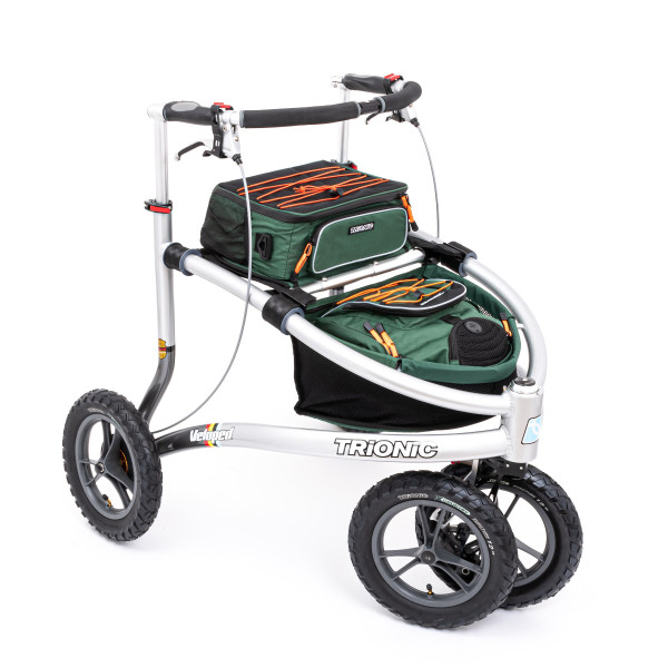 Die neuen Trionic Veloped Gelände Rollatoren sind mit 12″ und 14″ Rädern erhältlich. Umso größer das Rad, um so wendiger ist der Rollator im Außenbereich.Hierbei handelt es sich um den Veloped Trek mit 12″ in Größe M (für Körpergröße 150-189 cm).Der Veloped Trek ist ideal zum Wandern und Reisen geeignet. Es bietet mit Korb, Sitztasche und Rucksack genügend Stauraum.Die Sitztasche rastet auf dem Sitz ein und kann einfach nach vorne geklappt werden. Sie hat 3 separate Innentaschen, eine Außentasche mit Reißverschluss und zwei Netztaschen. Zudem hat sie einen abnehmbaren Riemen und kann auch einzeln als Umhängetasche genutzt werden.Der Rucksack passt perfekt in den Korb des Velopeds. Der Schulterriemen kann in einer getrennten Tasche verstaut werden. Er hat ein großes Hauptfach, eine obere Reißverschlusstasche und einen Schlitz für z.B. Kopfhörer. Zudem hat der Rucksack eine Außentasche mit Reißverschluss und zwei Netztaschen, für beispielsweise Wasserflaschen.Korb, Sitz, Sitztasche und Rucksack sind aus einem robustem und wasserabweisendem 600D Polyester mit reflektierenden Streifen.Neue Eigenschaften:Rahmen aus hydrogeformten, geschweissten 6061 Alu-RohrenTrionic X-Country Leichtgewichtsreifen: grobes Muster (ideal für’s Gelände), gute Federung, sehr leicht, T-Guard Pannenschutz und reflektierende Logos100% Edelstahl (inkl. Kugellager und Steckachsen)Leichtere Felgen und RadkugellagerKorbscheibe aus Carbon (Kohlefaser)2-farbige Lackierung silber grauGold-anodizierte BremsnabenNeue CST Schläuche, die den Druck deutlich länger behaltenNeue Radaufhängung des Kletterrades, jetzt mit allen Hauptteilen aus hochwertigem 6061-T6 AluminiumBewährte Eigenschaften:Luftbereifung und Federung für Komfort und Entlastung für die GelenkeAll-Terrain-Nabenbremsen: optimale Bremsleistung in jedem Gelände und bei jedem WetterTrionic Bremshebel aus Voll-Aluminium mit ParkbremseAbnehmbare Räder mit Schnellverschluss2-stufiger teleskopischer Falt-MechanismusTrionic Syncro Lenkung: synchronisierte Lenkfunktion verhindert flatternde oder verdrehte SchwenkräderTrionic Climbing Wheel: Hindernisse bis 13 cm leicht mit dem Kletterrad überwinden und Einstellbarkeit an Gelände- oder Stadtbetrieb3-Rad-Design für dauerhaften Bodenkontakt im GeländeVoll-Aluminium-Design aus 6061-T6 Aluminium: leichtes Gewicht und große SteifigkeitU-förmige, höhenverstellbare Haltestange sorgt für ergonomisch korrekte Körperhaltung und kann beim Sitzen als Rückenlehne genutzt werdenWinkelverstellbare Handgriffe mit Kraton-Gummi beschichtetWasserabstoßendes und austauschbares Textil-Zubehör aus 600D PolyesterRundum sichtbare Reflektoren für zusätzliche Sicherheit nachtsMaße:Griffhöhe: 75 – 95 cmEmpfohlene Körpergröße: 150 – 189 cmLänge: 102 cmBreite: 76 cmGriffbreite: 48 cmSitzhöhe: 58 cmSitzbreite: 44 cmSitztiefe: 25 cmRadgröße: 12″ 31 cmFaltmaß mit Rädern (H x L x B): 75 x 106 x 42 cmFaltmaß ohne Räder (H x L x B): 59 x 84 x 42 cmGewicht Gewicht ohne Räder: 12,5 kg 7,4 kgMax. Belastbarkeit: 150 kgFarbe:grün schwarz orangemarineblau schwarz gelbLieferumfang:1 Stück Trionic Veloped Trek 12er MInkl. Korb mit Reißverschlusstasche und Regenschutz, Sitztasche und Rucksack