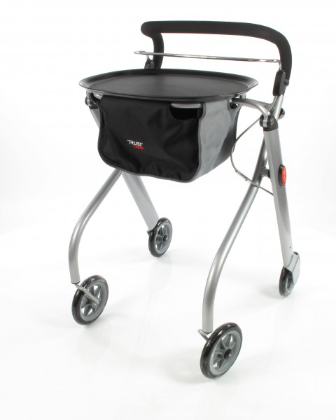 Hochwertiger, edler Rollator in elegantem silber Design für den Innenbereich. Der Indoor Rollator “Let’s Go” eignet sich besonders für den Innenbereich in Pflegeheimen oder Rehaeinrichtungen – wird aber auch im privaten Bereich sehr gerne eingesetzt. Durch die kleinen Räder ist er besonders wendig. Faltbar – bleibt in gefaltetem Zustand stehenDurchgehender Griff und durchgehender Bremsbügel – somit auch für Einhandbedienung (z.B. Hemiplegiker) geeignetInklusive Tablett und TascheTechnische Daten:Gewicht: 6,5 kg (ohne Tasche + Tablett)Tasche: ca. 0,2 kgTablett: ca. 0,4 kgGesamtbreite: ca. 55 cm, dadurch bei engen Platzverhältnissen einsetzbarBreite zwischen den Hinterrädern: ca. 49 cmGesamtlänge: ca. 63 cmGesamthöhe (verstellbar): ca. 83 – 94 cmTabletthöhe: 68 cmMax. Belastbarkeit: 100 kgTablettzuladung: max. 5 kgKorbzuladung: max. 3kgRädergröße: 15,5 cmFaltmaß: ca. 23 x 58 x 90 cm (L x B x H)Maße Tasche: ca. 33 x 20 x 15 cm (B x T x H)Material:Rollator: Kunststoff, AluminiumTasche: 100% Polyester