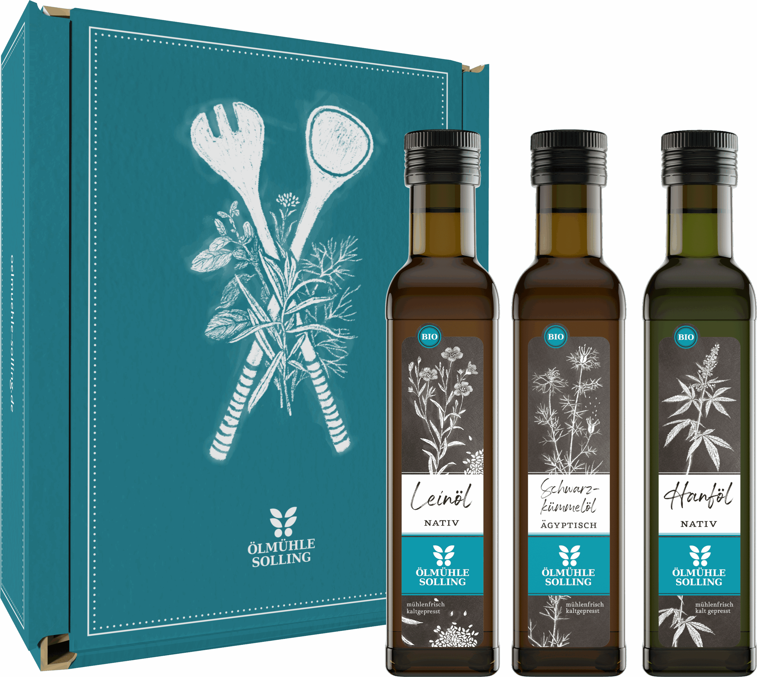Dieses Set besteht aus drei beliebten Vitalölen für gesundheitsbewusste Genießer. Es enthält natives Bio-Leinöl, -Hanföl, und -Schwarzkümmelöl aus schonender Kaltpressung.