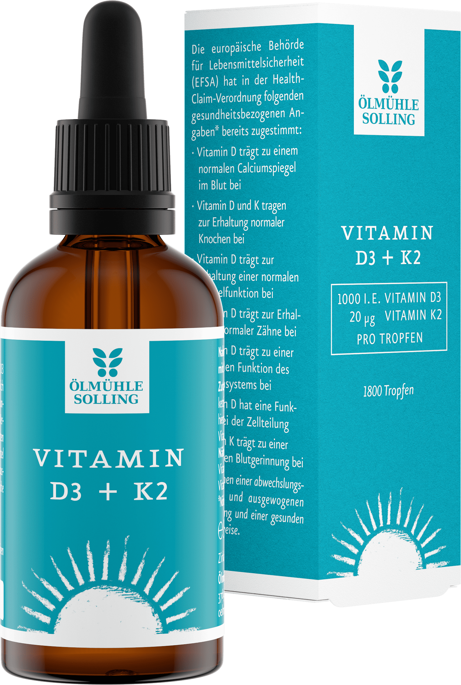 Das Vitamin D3 + K2 Öl wird auf Basis von MCT-Öl hergestellt. Ein Tropfen entspricht 1.000 Internationalen Einheiten Vitamin D und 20 μg Vitamin K.